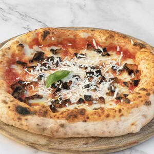 Pizza al ventaglio con salsa di pomodoro, melanzane fritte, prosciutto cotto, grana e stracciatella