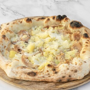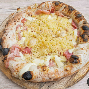 Fior di latte, panna, prosciutto cotto, patate gratinate, grana e pepe